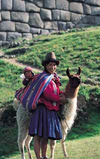 A woman dressed in the local, colorful colors, and carrying a baby on her back stands next to a llama. The most widely spoken languages in Peru are Spanish and the Indian languages Quechua and Aymará. Spanish and Quechua are the country's official languages. Mestizos generally speak Spanish, though they may speak Indian languages as well. Most of the people are Roman Catholics. Education is compulsory for all Peruvian children between the ages of 7 and 16. Almost all towns and villages have primary schools, but high schools and colleges are found mainly in the large cities. The National University of San Marcos in Lima, the capital, was founded in 1551 and is one of the oldest universities in the Americas. Way of Life Life in the Andean Highlands. Closely-knit families are the basic work and social groups of the highland people, who are called serranos. Farm families work together in the fields, and children take care of the animals. Children in highland towns also often help their parents. Almost all highlanders raise chickens, ducks, turkeys, and cuyes (guinea pigs) in their backyards. And picante de cuy (guinea pig with potatoes and pepper sauce) is a favorite highland food. Other popular dishes include thick vegetable and cereal soups, mutton, potatoes, and home-baked bread. The Indian people of the highlands live in small villages. They grow a variety of crops for their own use and raise livestock. The native Andean llamas, animals belonging to the camel family, are used for meat and as beasts of burden in southern Peru. A related animal, the alpaca, is also bred at high altitudes. The Indians spin and weave sheep and alpaca wool into beautiful ponchos and other clothing. The hard-working Indian farmers have chewed coca leaves for thousands of years. It was long thought that this was a bad habit. But recent studies show that chewing this leaf aids digestion and helps people adapt to high altitudes. Mestizo highlanders live in the towns, where they work as storekeepers, teachers, government officials, and technicians. They tend to be wealthier than the Indians, and they often employ Indians as servants or laborers. The Indians who work in the towns often learn Spanish and begin to adopt mestizo ways. They may stop chewing coca leaves, for example, or cease wearing traditional homespun wool clothing. People who alter their Indian culture in this way are usually called cholos. Highland life has many problems. Most of the people are poor, and the Indians have often been exploited. But education and increased contact with the outside world are bringing change to the highlands. Life in the Amazon Region. The eastern slopes of the Andes and the interior lowland are part of the huge basin of the Amazon River. Only 12 percent of the people live in this vast area. About 50 different Indian tribes such as the Campas, the Shipibos, and the Aguarunas live in small villages near the rivers and lakes. There they farm, hunt, and catch fish. The Indian peoples of this region have lived in this way for thousands of years. The government has built airports and roads to encourage the development of the remote Amazon frontier. The Indian way of life is changing rapidly as the Indians come into closer contact with other Peruvians. For most Indians, change has created serious economic and social problems. Paul L. Doughty