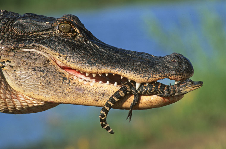 The mother alligator brings her new babies to the water. She carries them in her mouth. The babies can swim right away. They will catch small fish and tadpoles to eat.