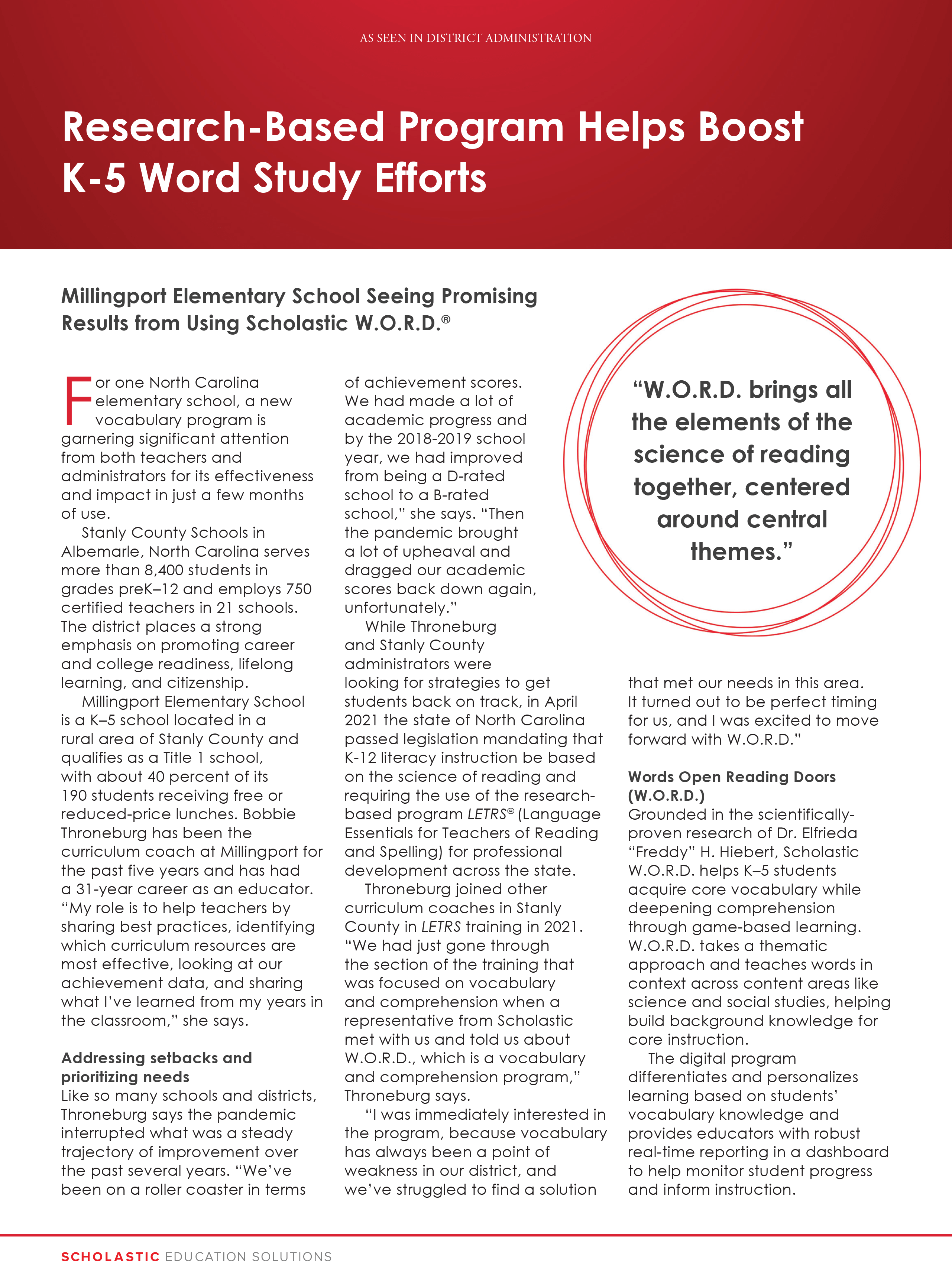 Scholastic W.O.R.D. is a vocabulary, comprehension, and knowledge program for Grades K–5 that systematically exposes students to the 2,500 morphological word families that are known to boost reading comprehension. This third-party case study highlights how W.O.R.D. promoted vocabulary instruction at Millingport Elementary in Albemarle, NC by providing students with game-based learning experiences and helping educators to put their science of reading training into everyday practice. With Scholastic W.O.R.D., students’ vocabulary and fluency scores increased, while educators gained more visibility into students’ specific learning needs.